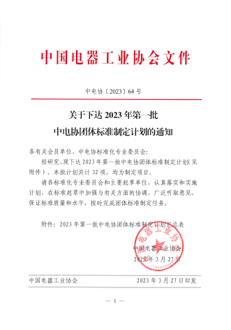 2023年3月27日,中电协[2023]64号《关于下达2023年第一批中电协团体标准制定计划的通知》,下达了中电协团标《建筑机器人分类》、《建筑机器人通用技术条件》、《建筑机器人通信架构及协议导则》、《重载工业机器人通用技术条件》、《家用和类似用途服务机器人智能化评价规范》、《机器人抓取算法测评规范》(发文序号26~31)。